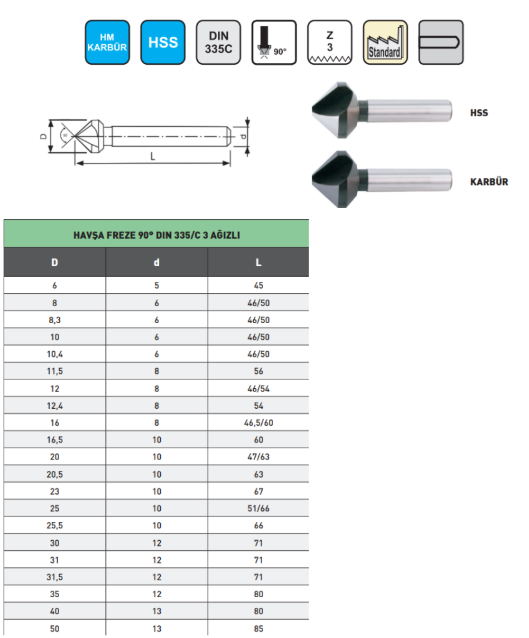Pld 20.5mm Karbür Havşa Freze 90° DIN335/c