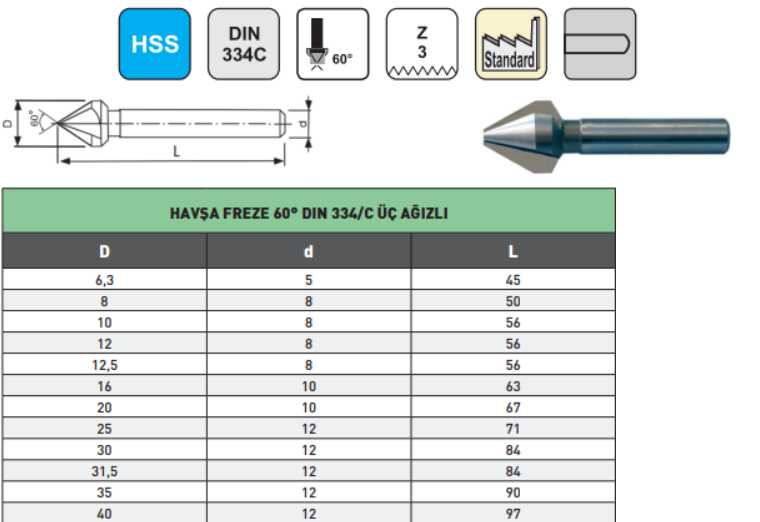 Pld 20mm Havşa Freze 60° HSS DIN334/c
