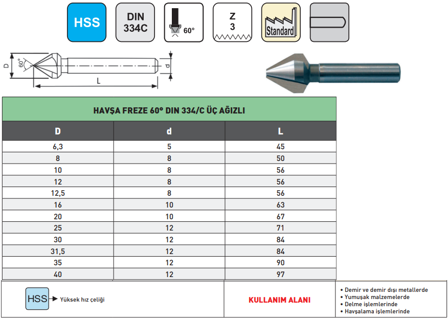 Pld 25mm Havşa Freze 60° HSS DIN334/c