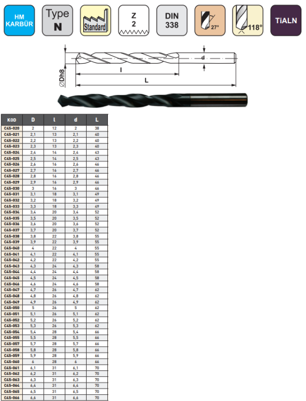 Pld 6.5x63x101mm Karbür Matkap Ucu DIN338 TIALN