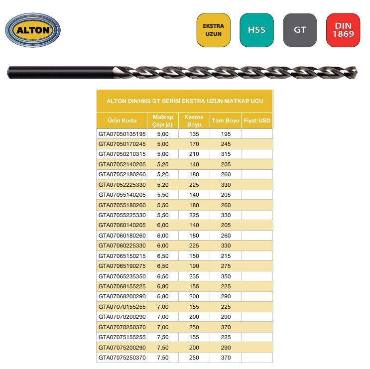 ALTON GT Serisi DIN1869/2 Matkap Ucu - 5X170X245
