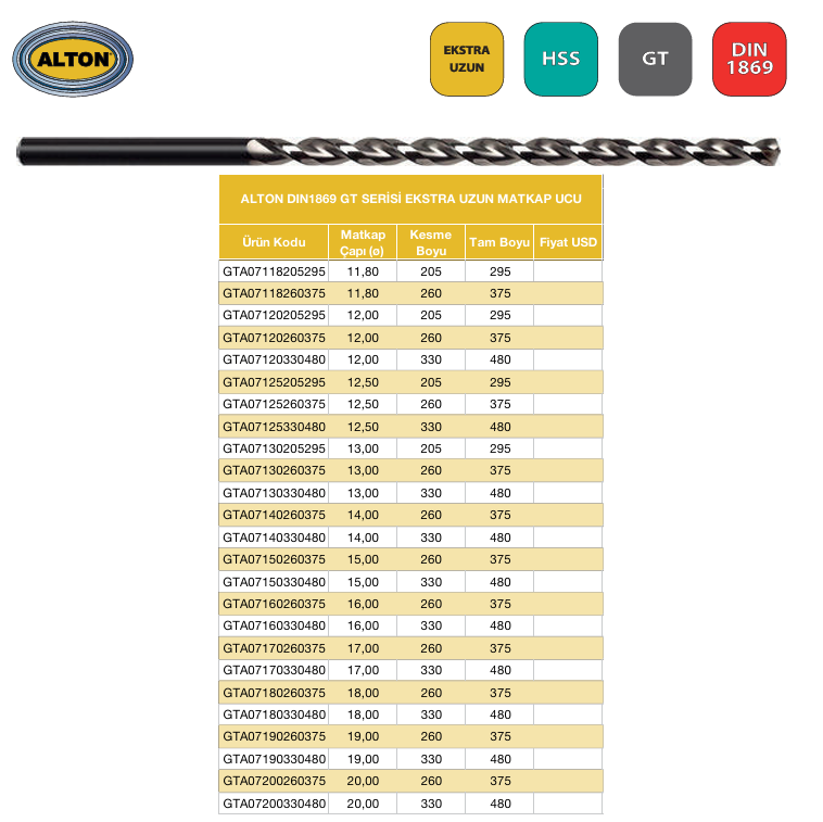ALTON GT Serisi DIN1869/3 Matkap Ucu - 12X330X480