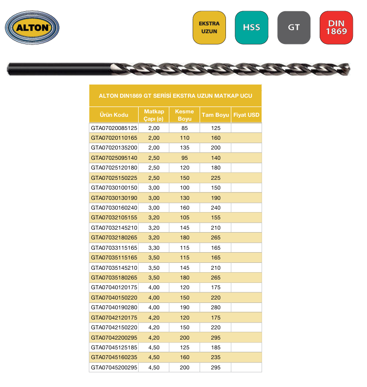 ALTON GT Serisi DIN1869/3 Matkap Ucu - 4.2X200X295