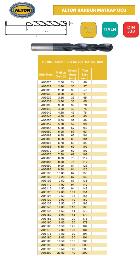 ALTON Standart Boy Karbür Matkap Ucu - 13X13X110X160