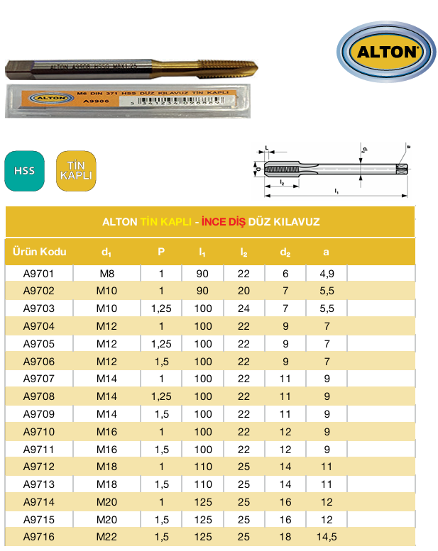 Alton Tin Kaplı İnce Diş Düz Makine Kılavuzu - M20x1.5