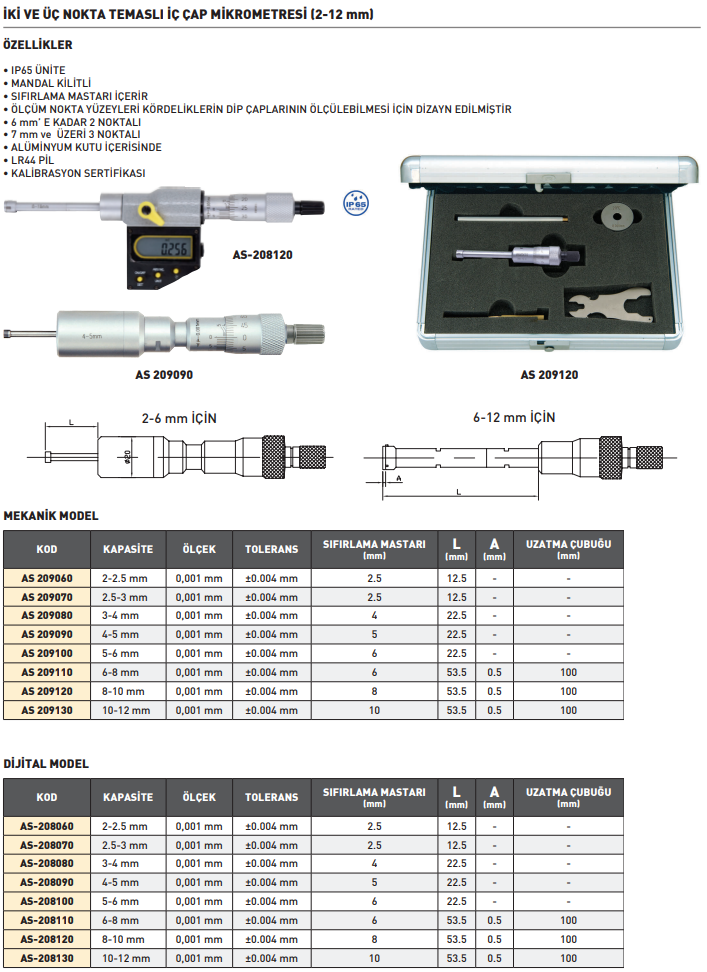 Asimeto İki Ve Üç Nokta Temaslı İç Çap Mekanik Mikrometre 2-2.5mm AS-209060
