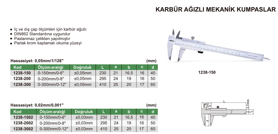 INSIZE 1238-150 MM Mekanik Kumpas Karbür Ağızlı