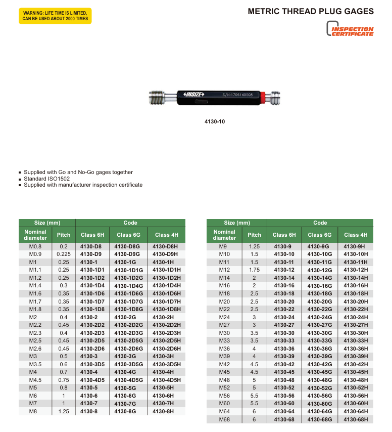 INSIZE 4130-3 Metrik Diş Vida Tampon Mastarı M3x0.5