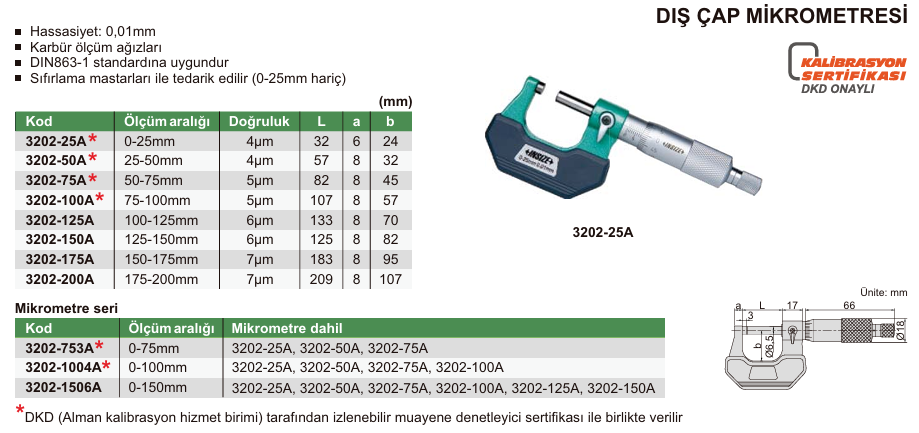 Hassasiyet: 0,01mm Karbür ölçüm ağızları DIN863-1 standardına uygundur Sıfırlama mastarları ile tedarik edilir