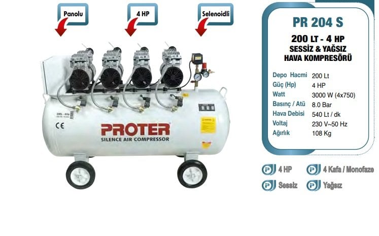 PROTER 200 Litre PR 204 S Sessiz Ve Yağsız Hava Kompresörü