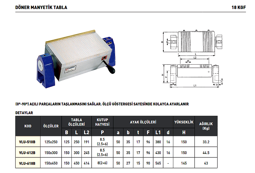 VERTEX VLU-510B, 125x250 mm tabla ölçüsüne sahip, dikey eksende 0° ile 90° arasında ayarlanabilen kalın çizgili (standard pole) döner manyetik tabladır.